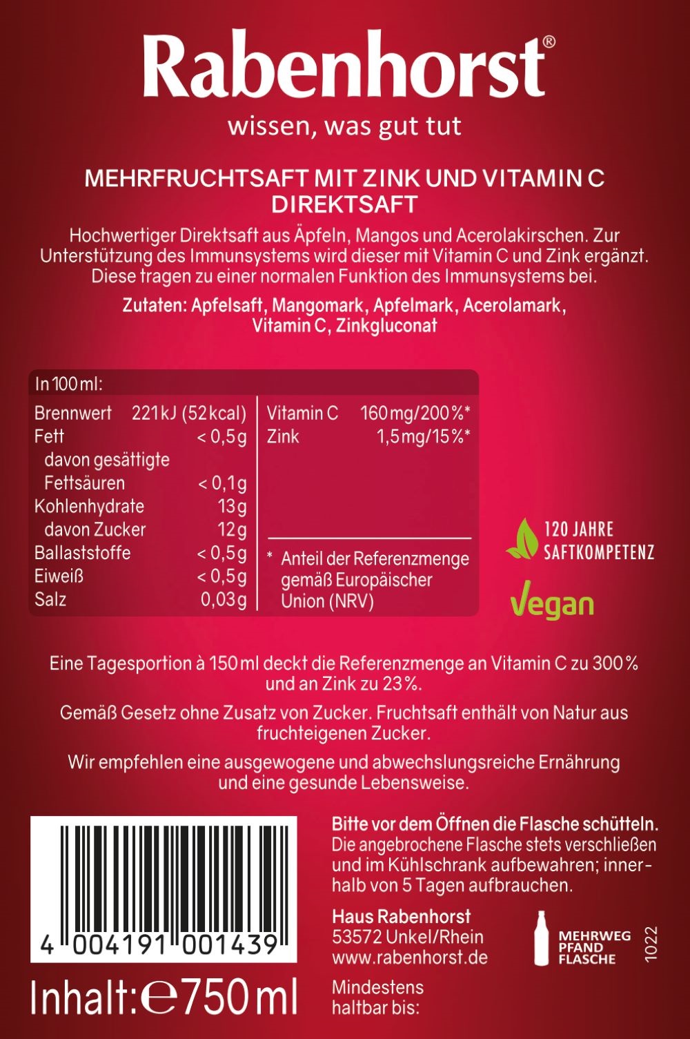 RABENHORST Für das Immunsystem 6er Pack (6 x 700 ml). Mehrfruchtsaft mit Zink und Vitamin C zur Unterstützung des Immunsystems