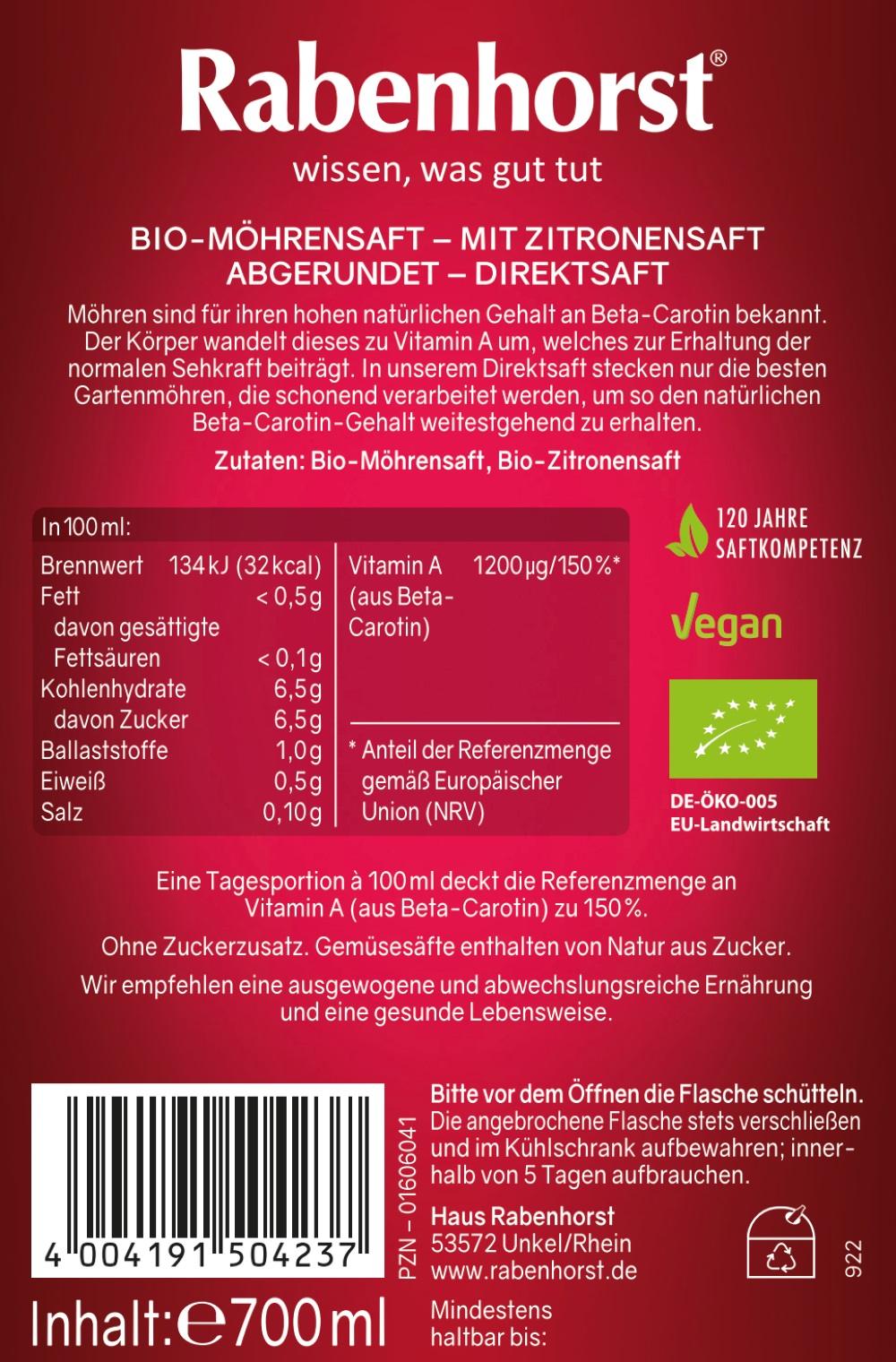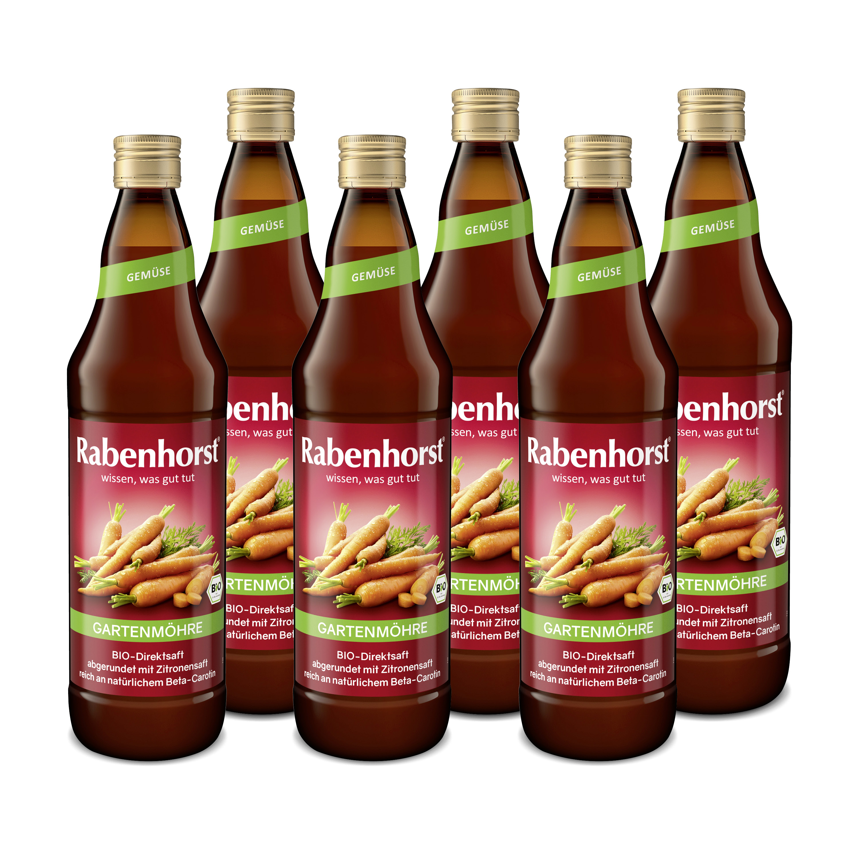 RABENHORST Gartenmöhre BIO 6er Pack (6 x 700 ml) - Hochwertiger Möhrensaft mit Zitronensaft abgerundet
