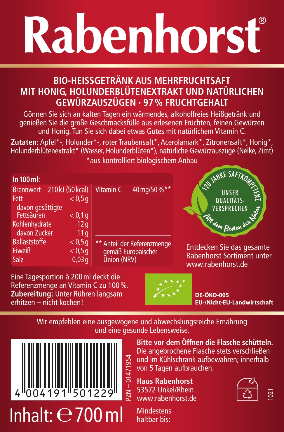 RABENHORST Heißer Rabe BIO 6er Pack (6 x 700 ml) – Unser klassisches Heißgetränk ohne Alkohol mit natürlichem Vitamin C