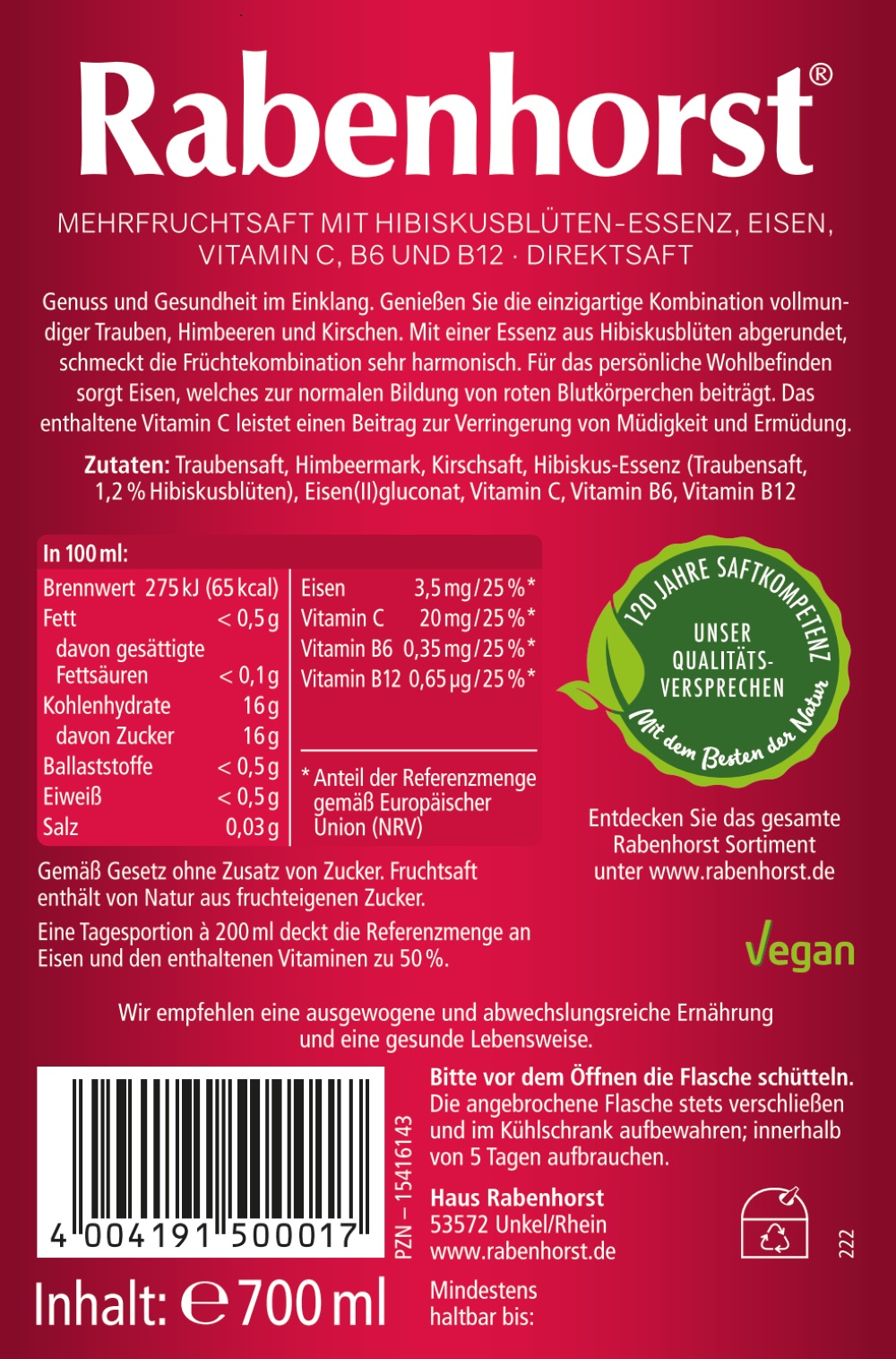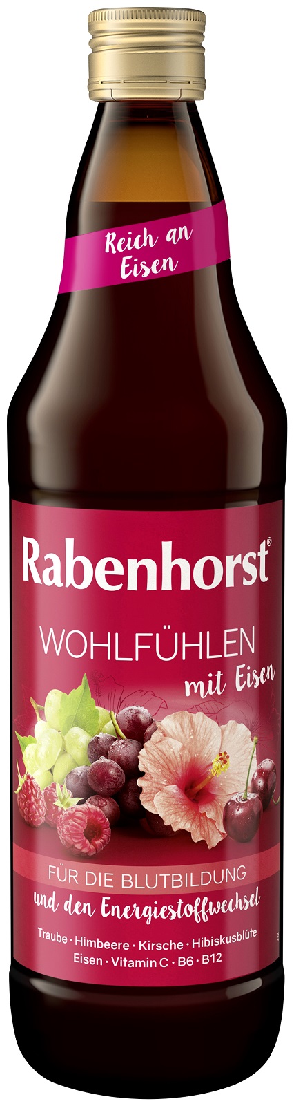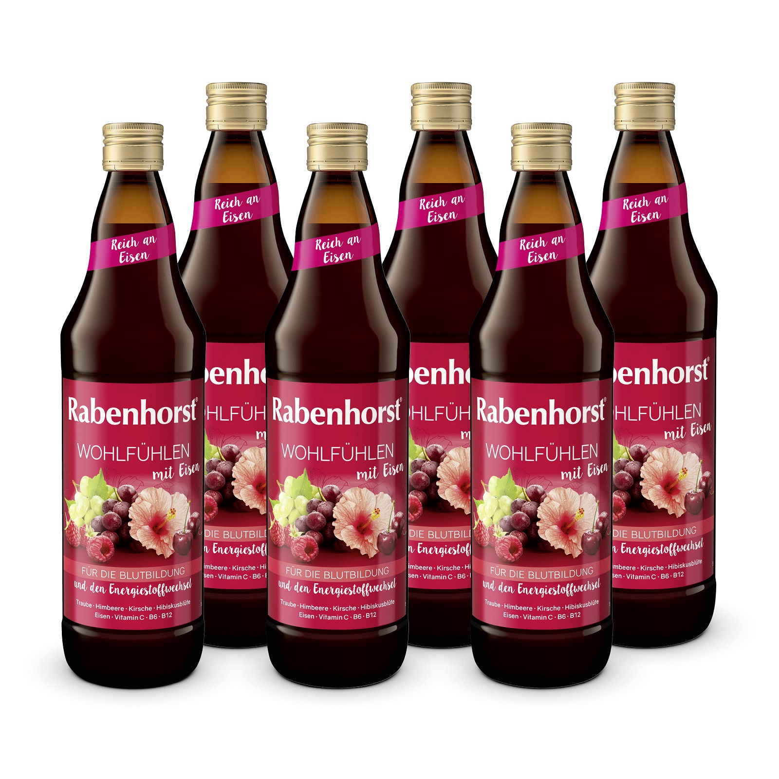 RABENHORST Wohlfühlen mit Eisen 6er Pack (6 x 700 ml). Mehrfruchtsaft mit Hibiskusblüten-Essenz, Eisen, Vitamin C, B6 und B12 für die Blutbildung und den Energiestoffwechsel