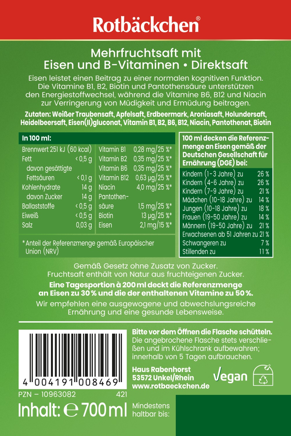 Zutaten: Weißer Traubensaft, Apfelsaft, Erdbeermark, Aroniasaft, Holundersaft, Heidelbeersaft, E579 Eisen(II)-gluconat, Vitamin B1, Vitamin B2, Vitamin B6, Vitamin B12, Niacin, Pantothenat, Biotin