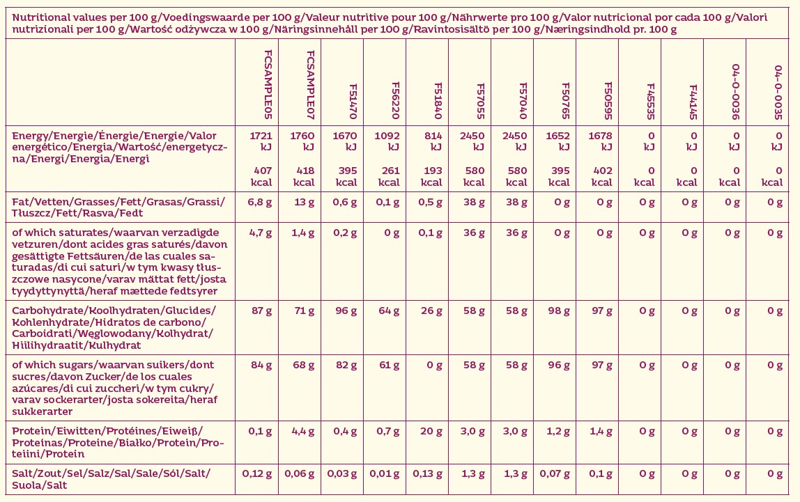 Zutaten: Glyzerin, Propylenglykol, Farbstoff: E110 (Gelborange S), Verdickungsmittel: E551. E110: Kann Aktivität und Aufmerksamkeit bei Kindern beeinträchtigen. Verwendungshöchstmenge: 0,8 g/kg. Backfest bis 200°C.